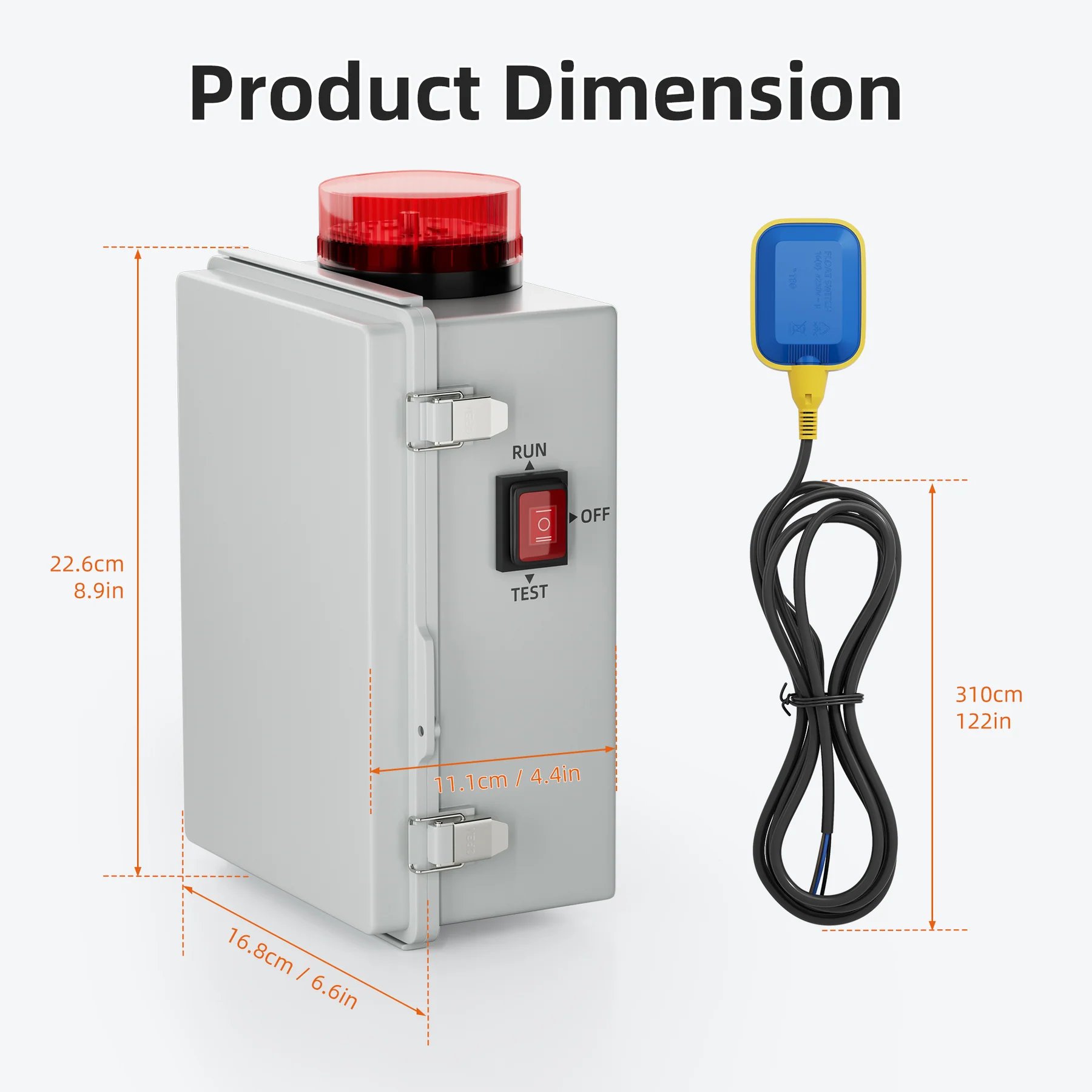 【A korai árvíz figyelmeztetés erőteljes riasztással】- Ezt az olajteknő szivattyú riasztást úgy tervezték, hogy gyorsan figyelmeztesse Önt a potenciális árvízre. A nagyvilágítású riasztási lámpa hatékony vizuális riasztást (≥110dB) kínál, így még zajos környezetben is könnyen észrevehető.