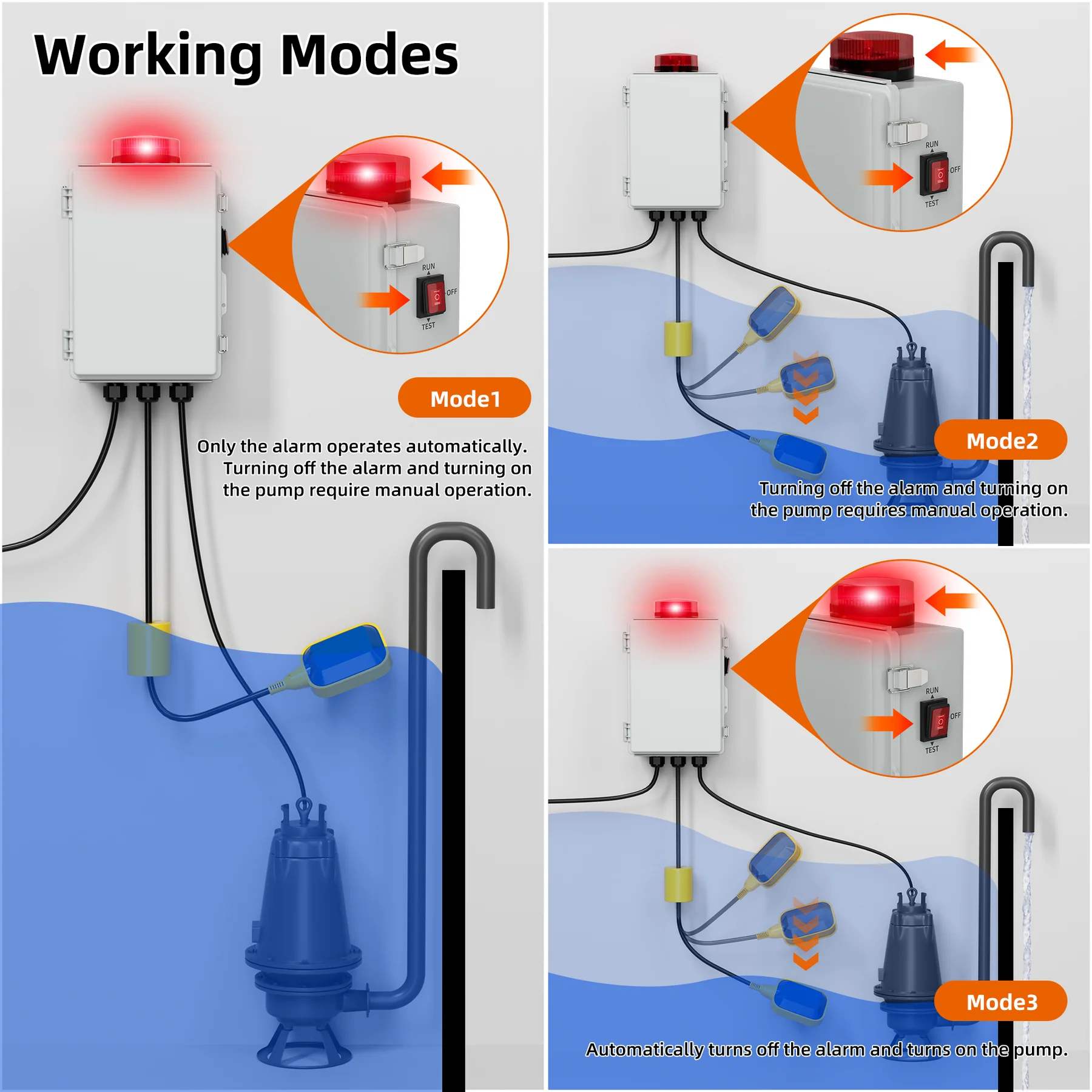 【Sokoldalú működési módok】- A szivattyú-vezérlő rendszer rugalmas üzemmódokat kínál a különféle igényekhez. Az 1. mód automatikusan aktiválja a riasztást, de kézi szivattyú -működést igényel, ahogy a képek részletezik. A 2. módhoz a riasztás és a szivattyú bekapcsolásához a kézi szivattyú működése szükséges. A 3. mód automatikusan vezérli a szivattyút, és a vízszint alapján bekapcsolja a riasztást.