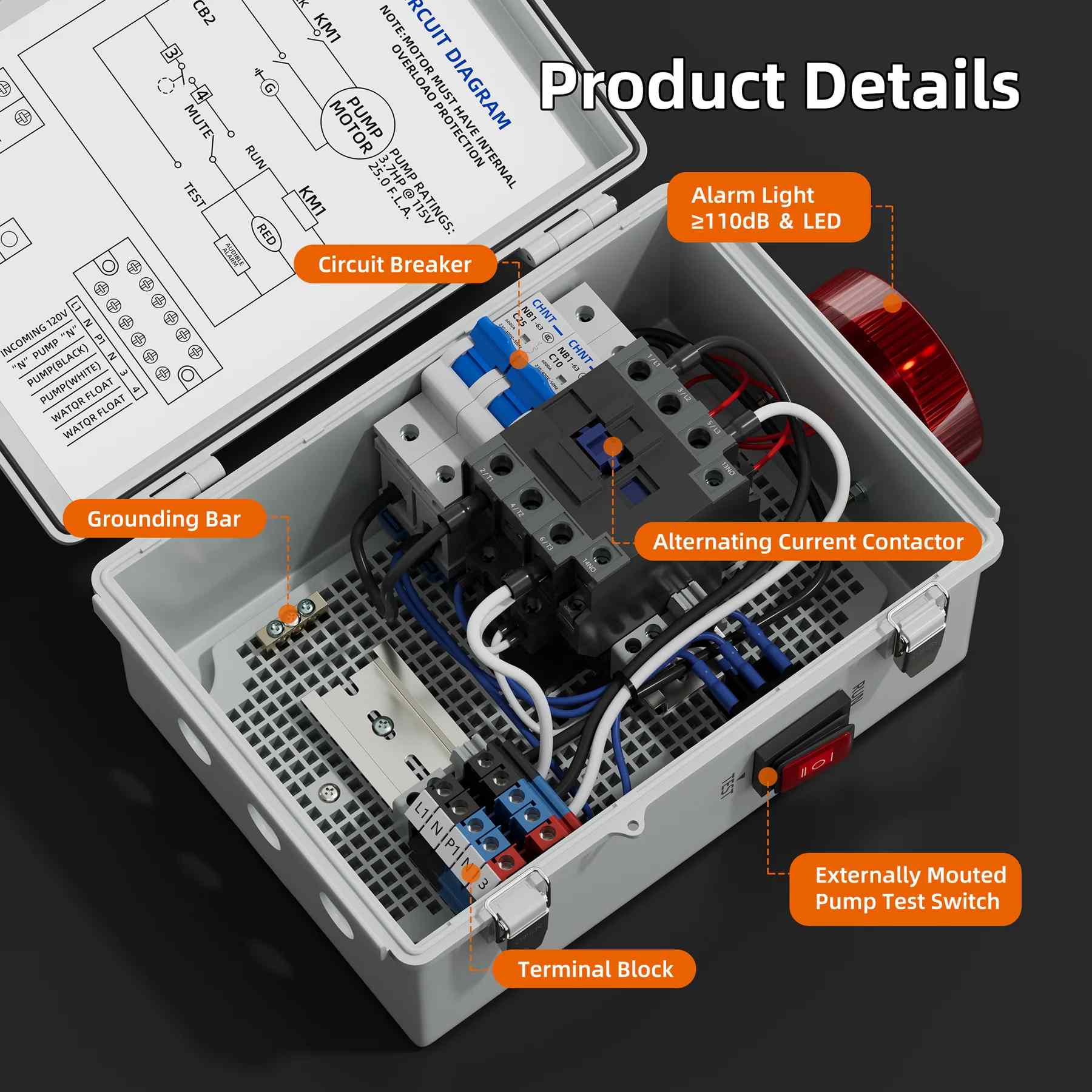 【Átfogó áramkör és egyszerű telepítés】- Ez a riasztás és a szivattyúvezérlő a teljes telepítéshez szükséges összes alkatrészt kínálja. A rendszer tartalmaz egy külső szivattyú -tesztkapcsolót, egy váltakozó áramkontaktort, egy földelő sávot és egy terminálblokkot, amint azt a diagram mutatja. A mellékelt alkatrészek és a mellékelt áramköri rajz (a képekben látható) támogatja a könnyű telepítést.
